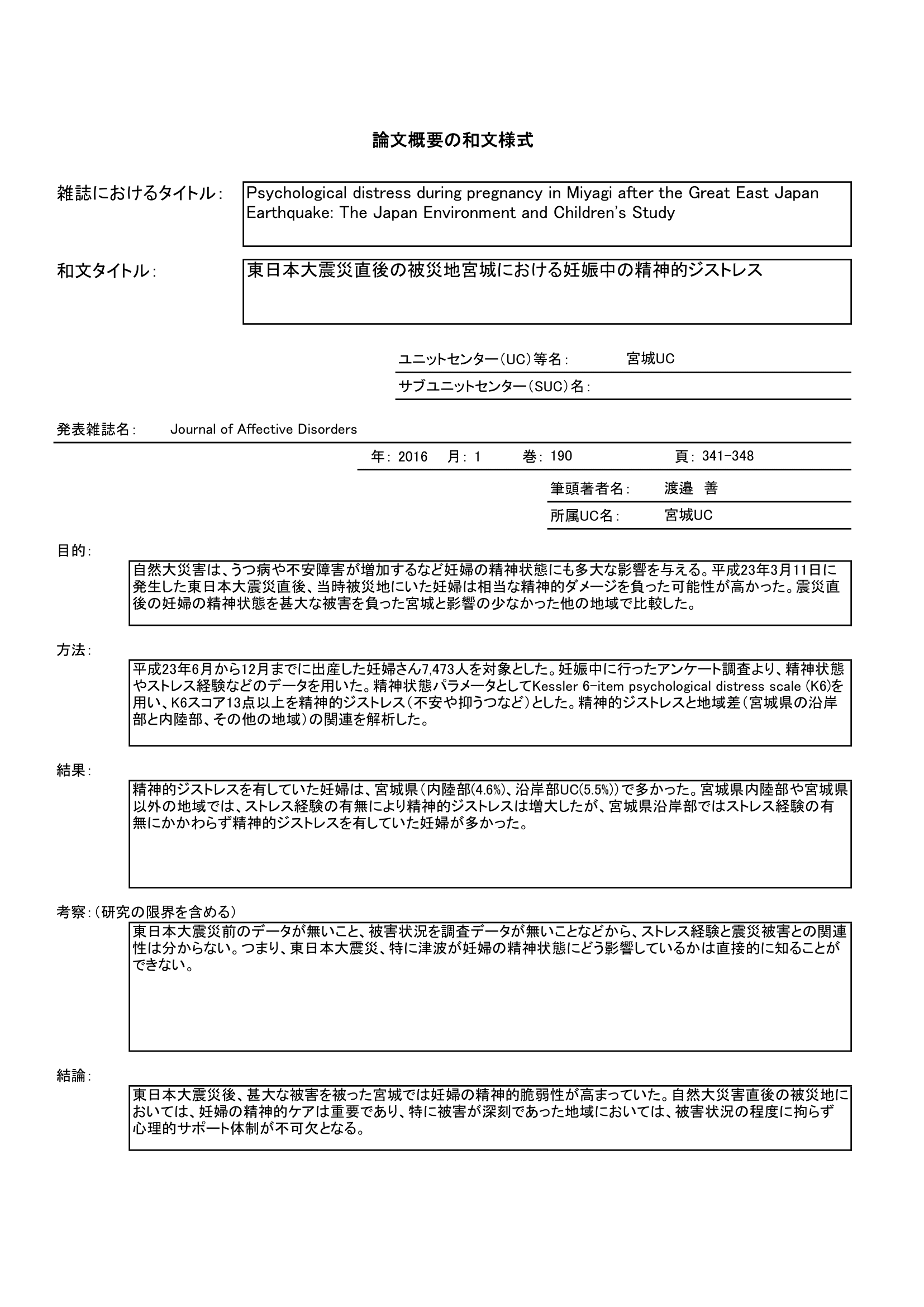 - 宮城県沿岸部ではストレス経験の有無にかかわらず精神的ジストレスがある妊婦が多かった
