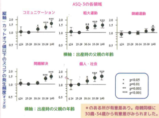 25歳から29歳を比較対象としたところ、父親・母親ともに30歳以上のグループで、すべての領域で発達遅滞となる頻度が高くなりました。