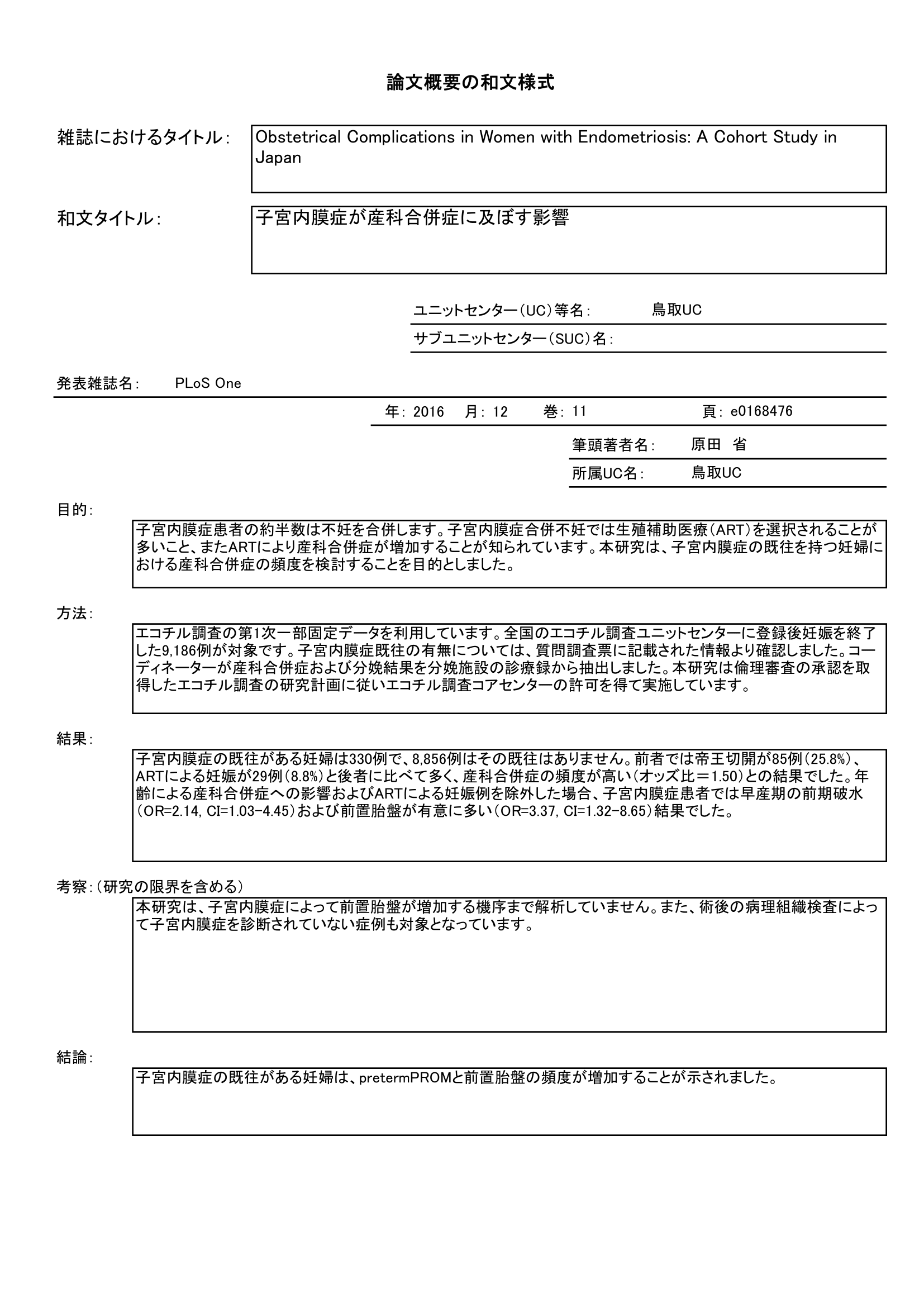 - 子宮内膜症の既往と産科合併症の頻度との関連を調査