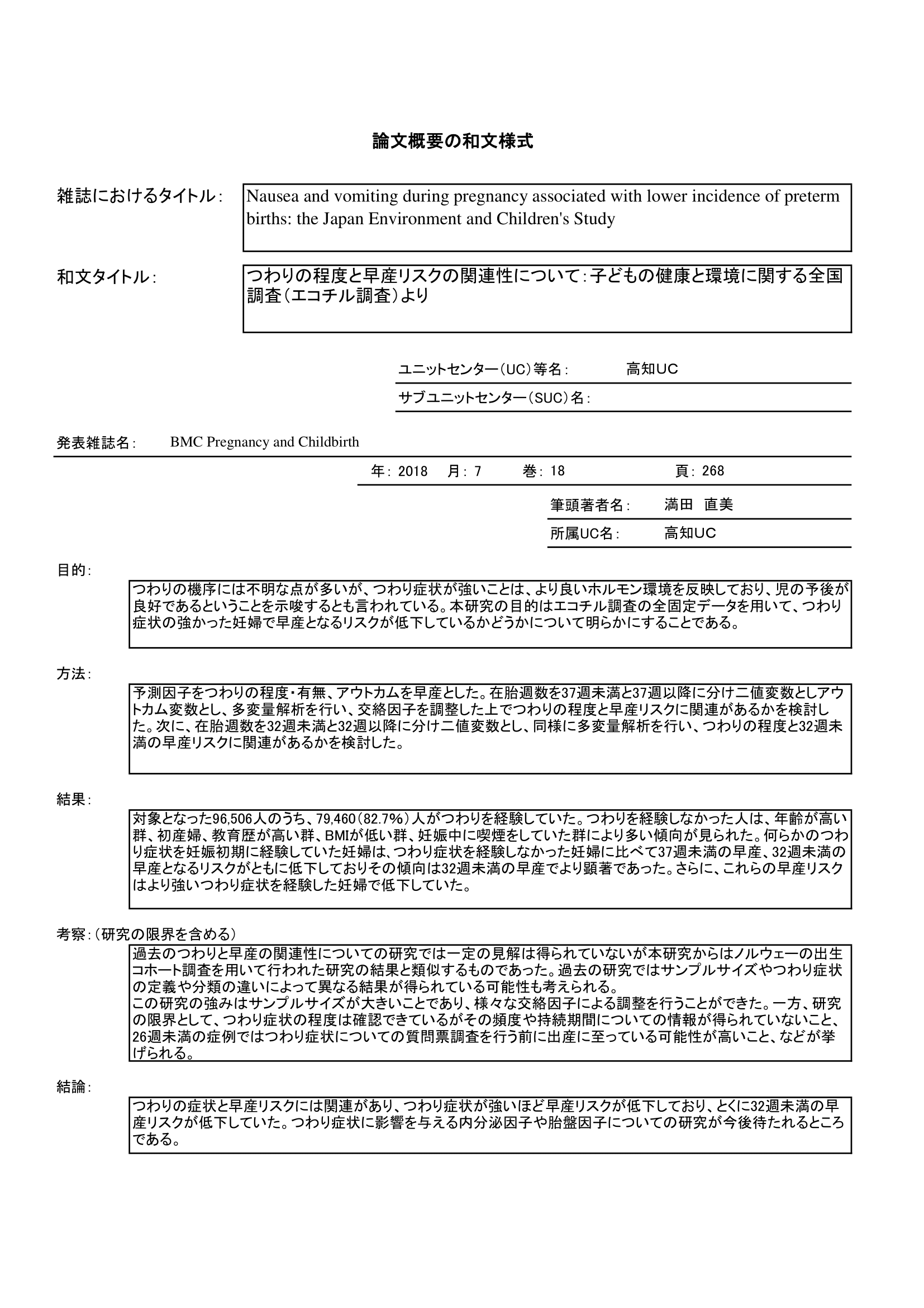 - つわり症状と早産との関連を調査