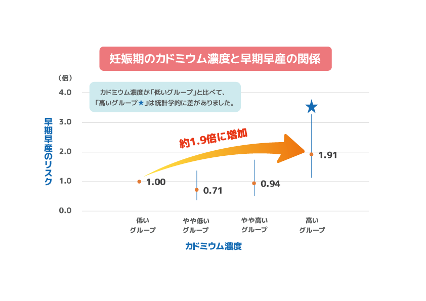 妊婦の血中カドミウム濃度が最も高い群は、最も低い群と比較して、早期早産の頻度が1.9倍高いことがわかりました。