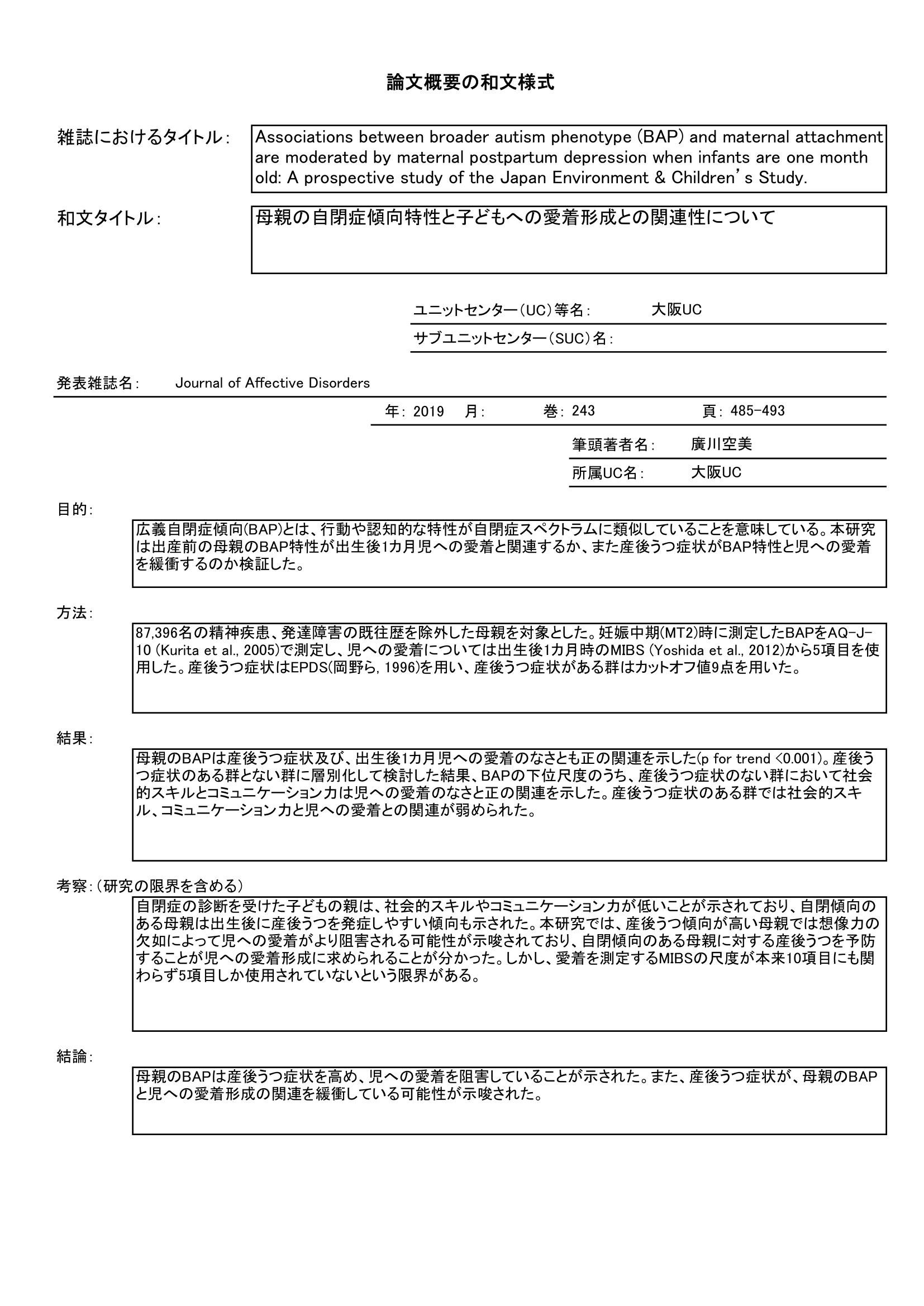 - 妊娠中の自閉傾向と出生後1カ月児への愛着の関連を調査