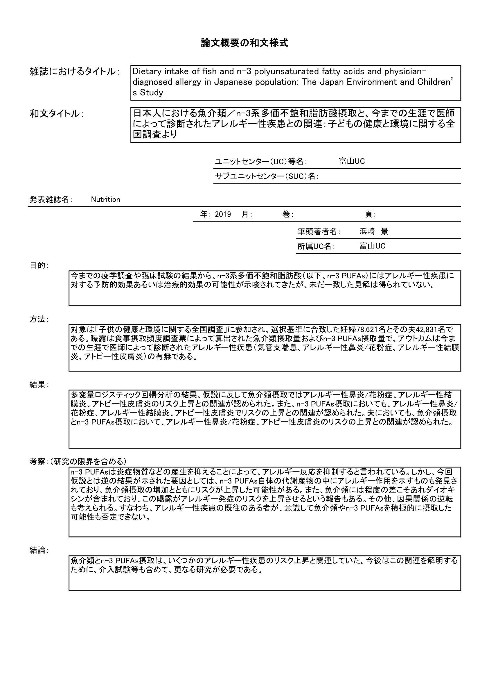 日本人における魚介類/n-3系多価不飽和脂肪酸摂取と、今までの生涯で医師によって診断されたアレルギー性疾患との関連:子どもの健康と環境に関する全国調査より