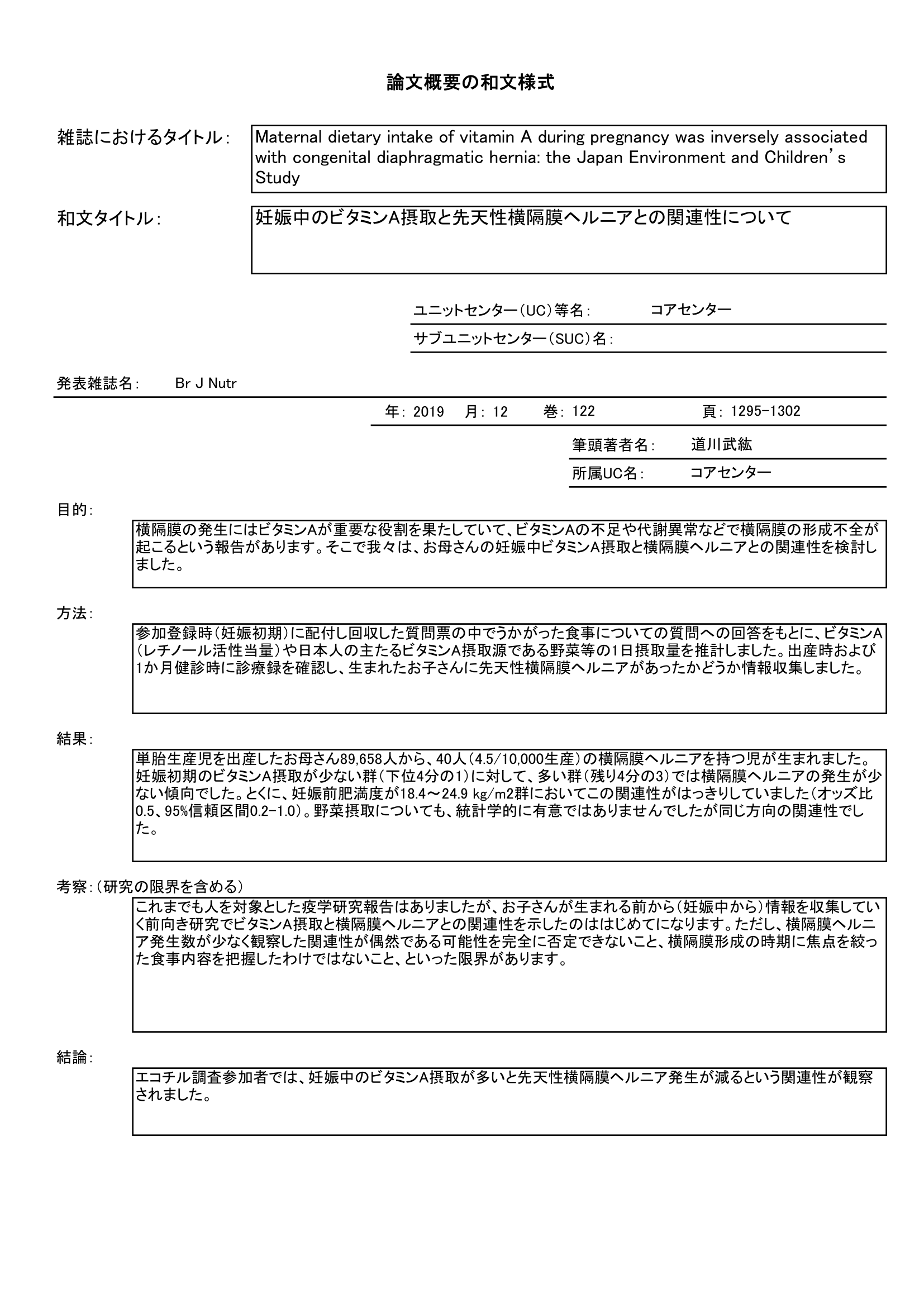 - 妊娠中のビタミンA摂取と出生児の先天性横隔膜ヘルニア発生との関連を調査