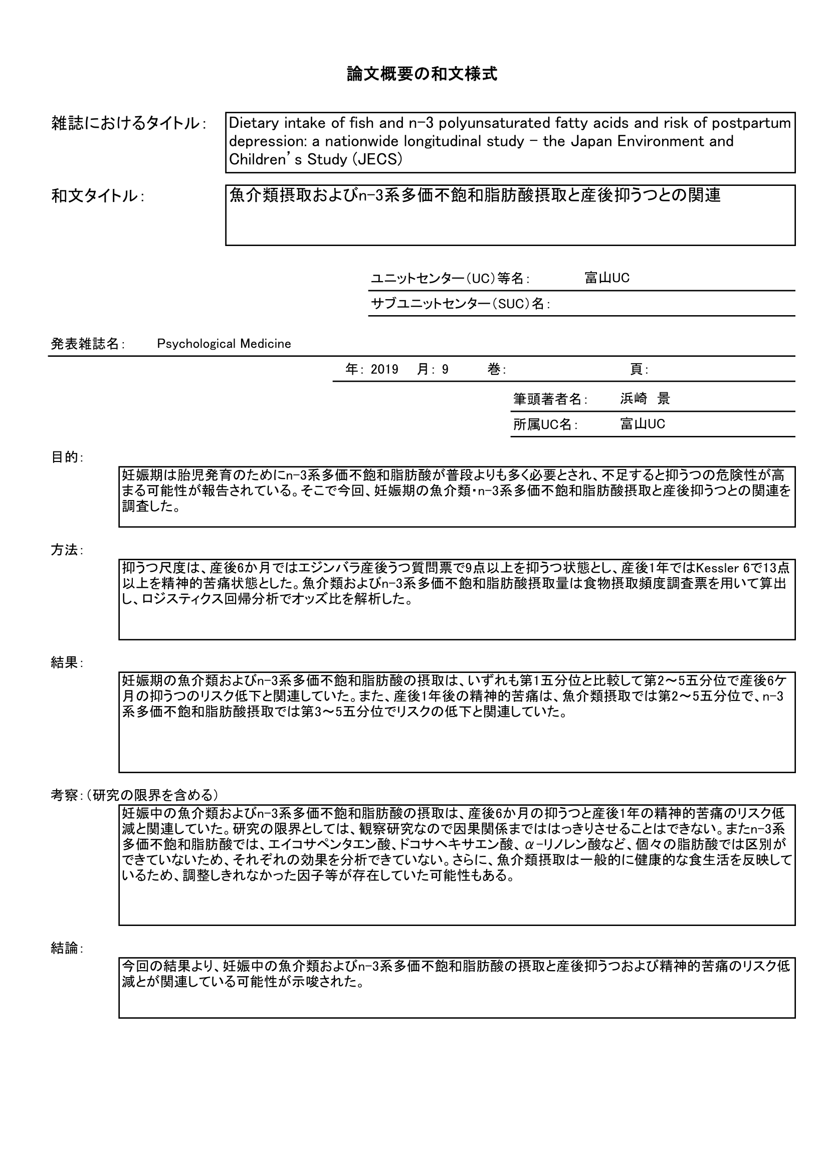 - 母親の妊娠中の魚介類、n-3系多価不飽和脂肪酸摂取と産後抑うつとの関連を調査