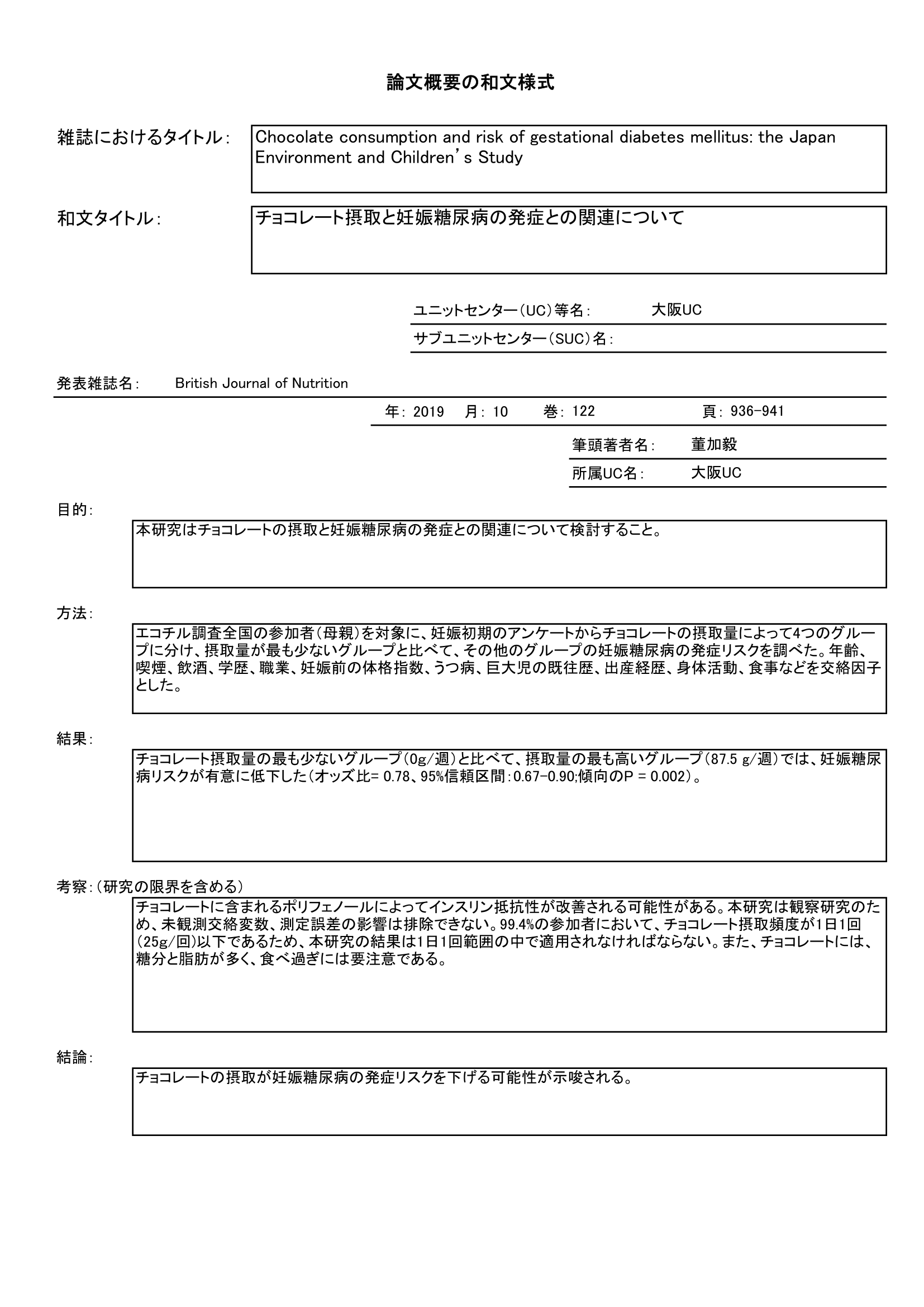 - 妊娠期のチョコレート摂取と妊娠糖尿病の発症リスクとの関連を調査