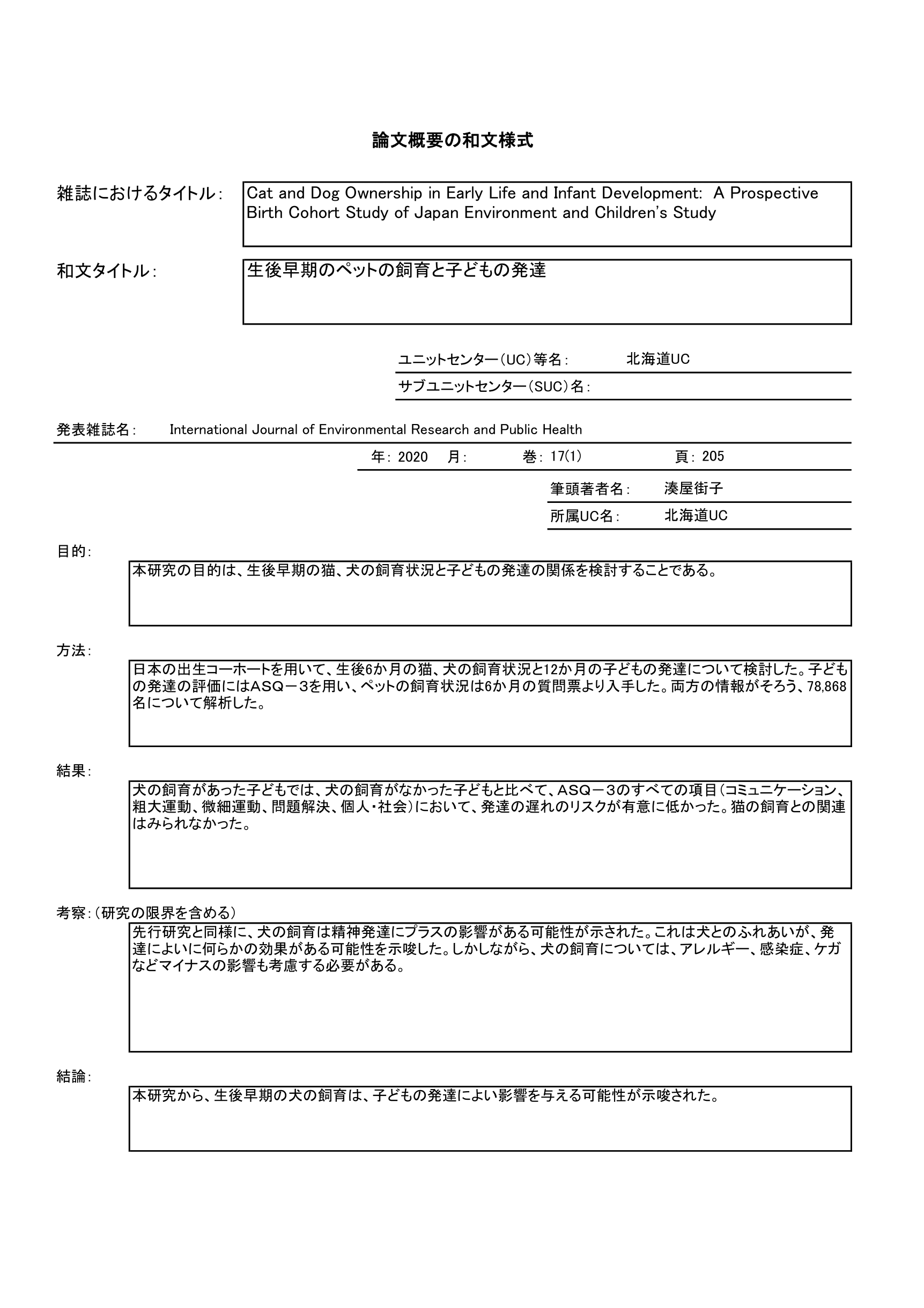 - 生後6カ月時の猫・犬の飼育と12カ月時の児の発達の関連を調査
