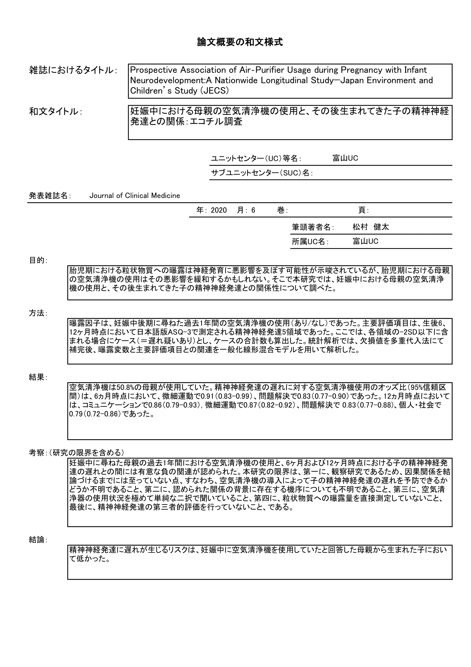 - 母親の妊娠中の空気清浄機の使用と児の6か月と12か月時の精神神経発達との関連を調査