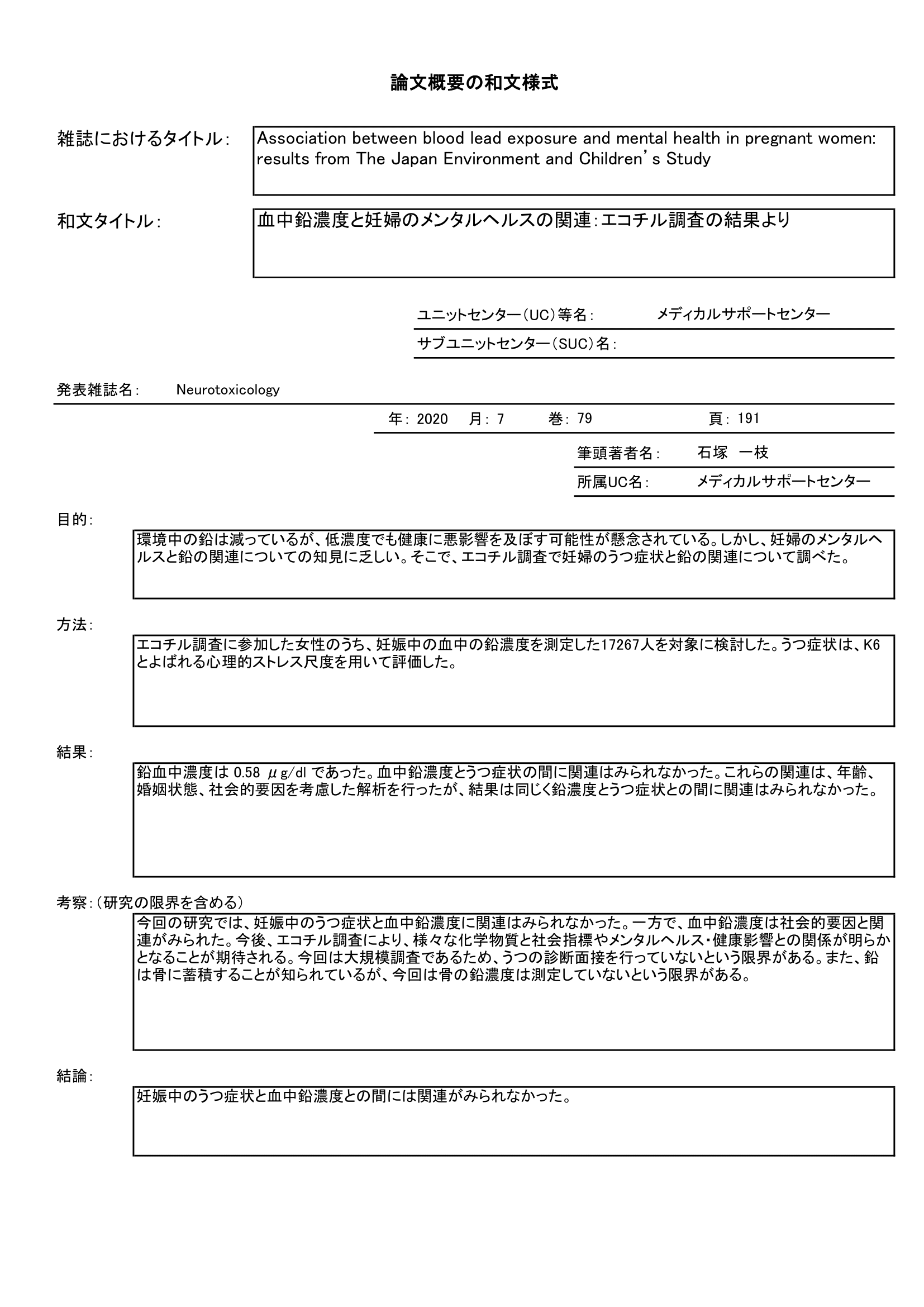 - 母親の妊娠中の血中鉛濃度とメンタルヘルス(うつ症状)との関連を調査