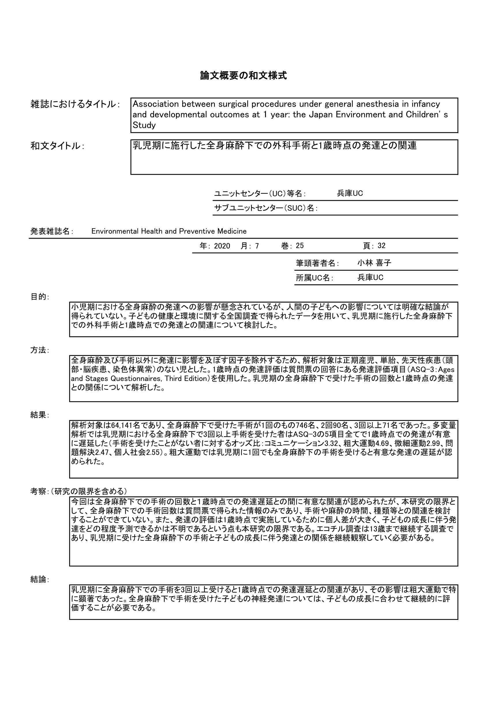 - 乳児期の全身麻酔下での外科手術と1歳時の発達との関連を調査