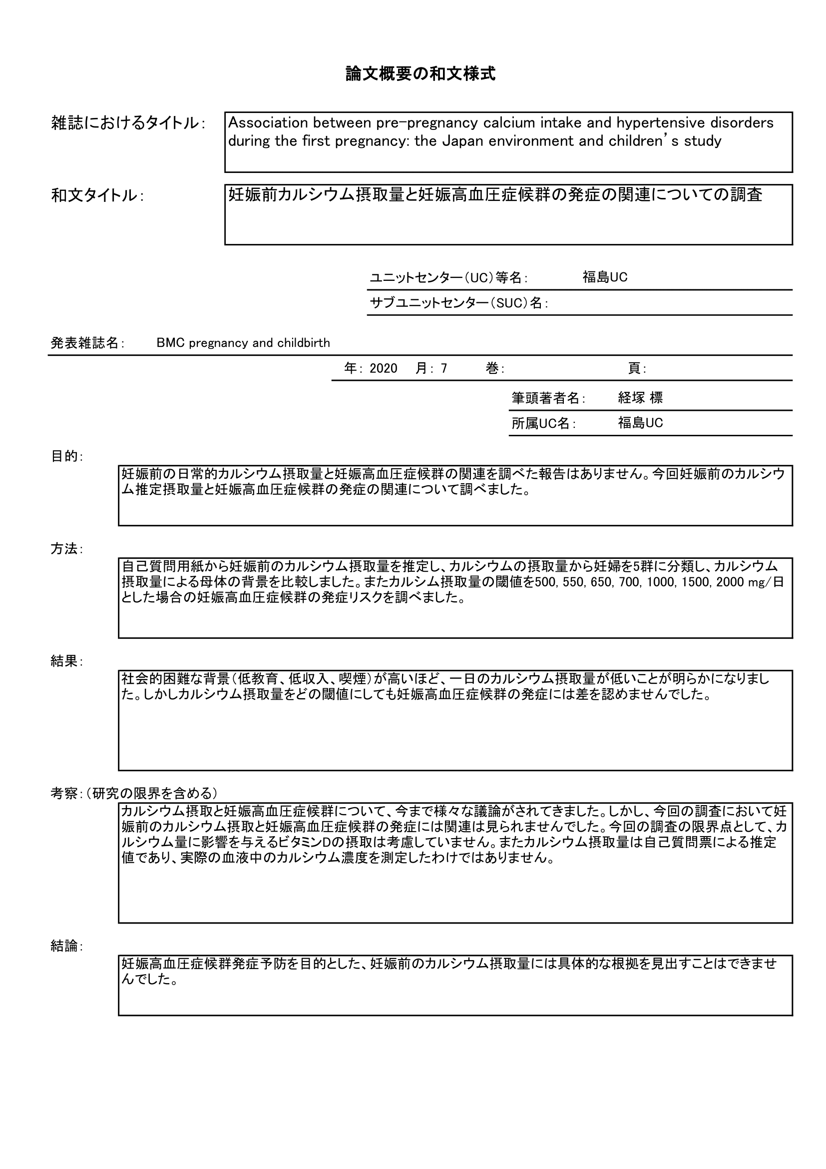 - 母親の妊娠前のカルシウム推定摂取量と妊娠高血圧症候群の発症との関連を調査