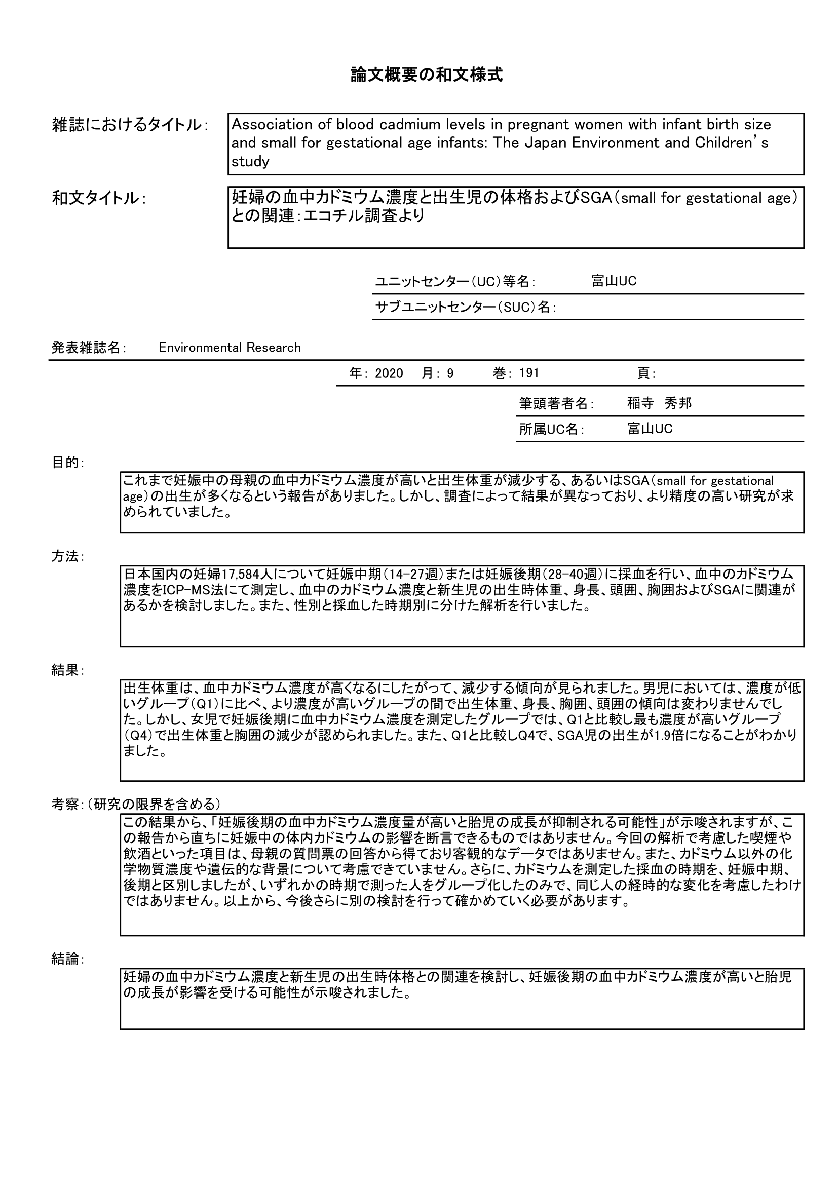 - 妊娠中の母親の血中カドミウム濃度と出生児の体格・SGAとの関連を調査