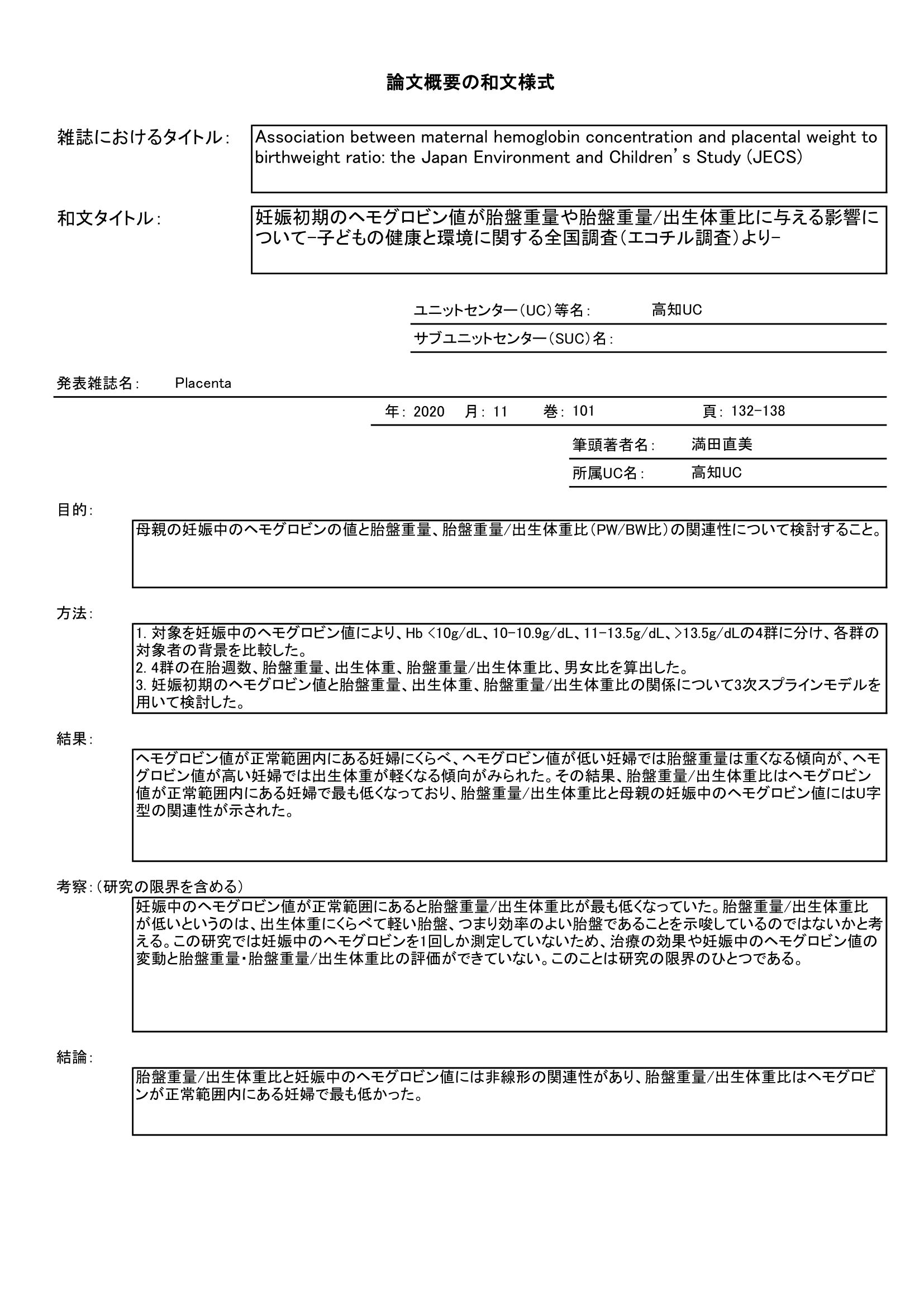 妊娠初期のヘモグロビン値が胎盤重量や胎盤重量/出生体重比に与える影響について-子どもの健康と環境に関する全国調査(エコチル調査)より-
