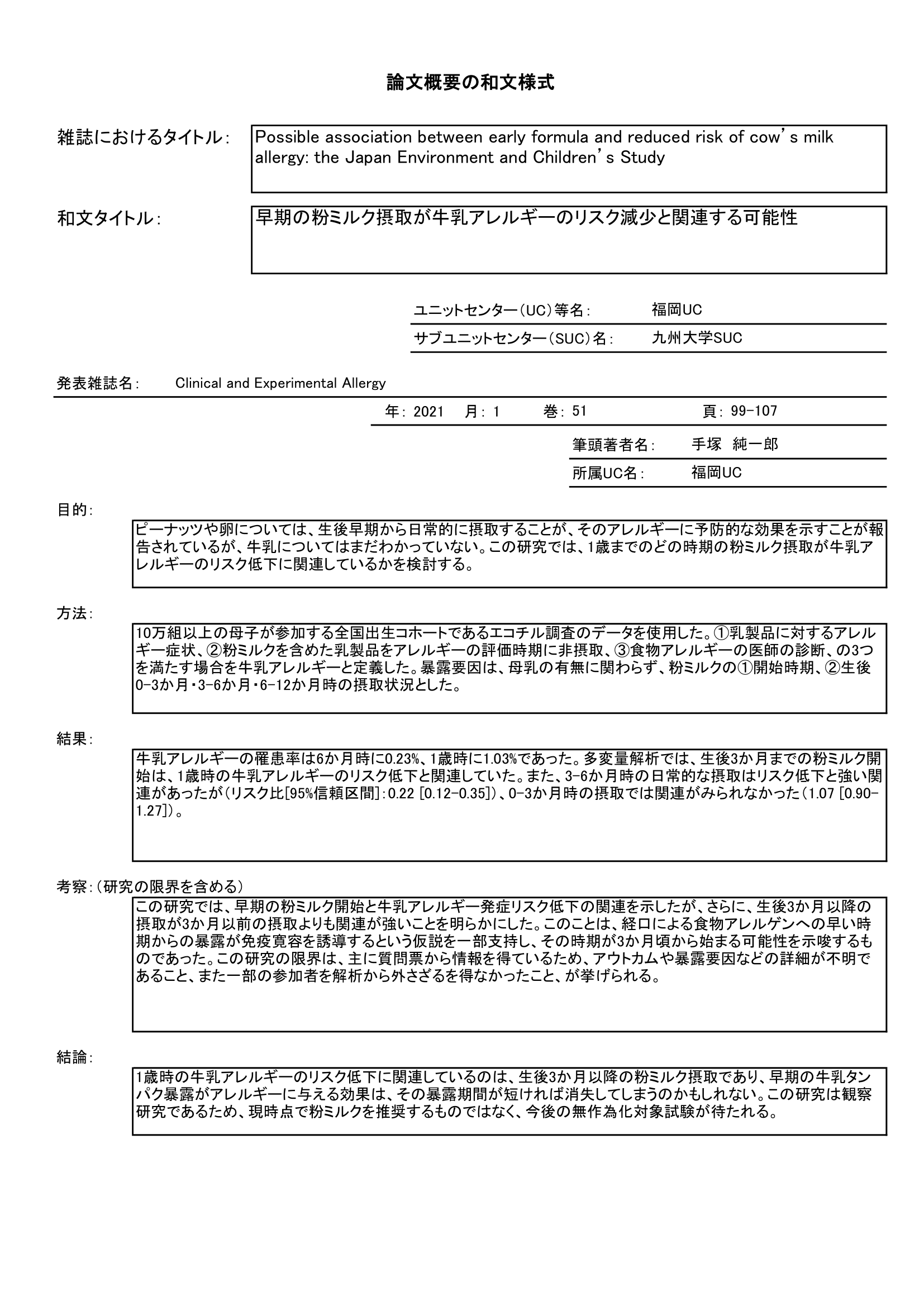 - 1歳までの粉ミルク摂取と牛乳アレルギーとの関連を調査