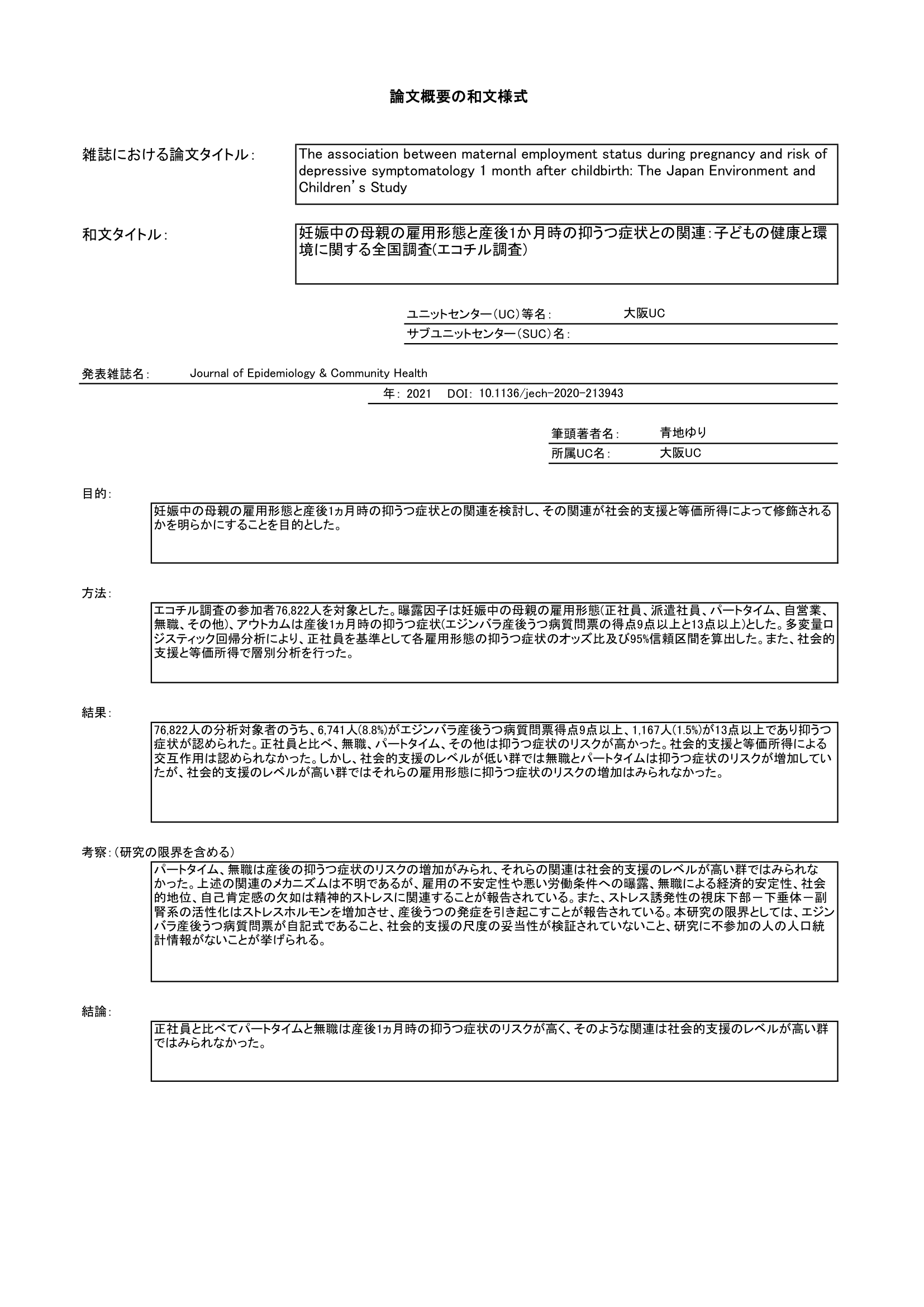 - 妊娠中の母親の雇用形態と産後1ヵ月時の抑うつ症状との関連と、社会的支援と等価所得による交互作用を調査