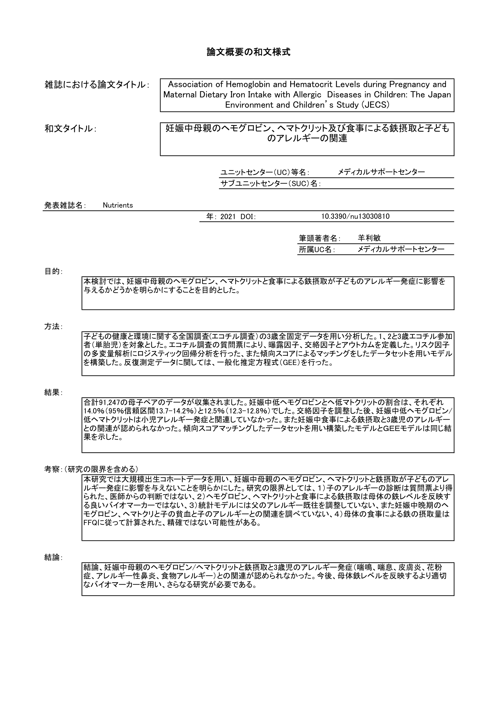 - 妊娠中の母親のヘモグロビン、ヘマトクリットおよび食事での鉄摂取と子のアレルギー発症との関連を調査