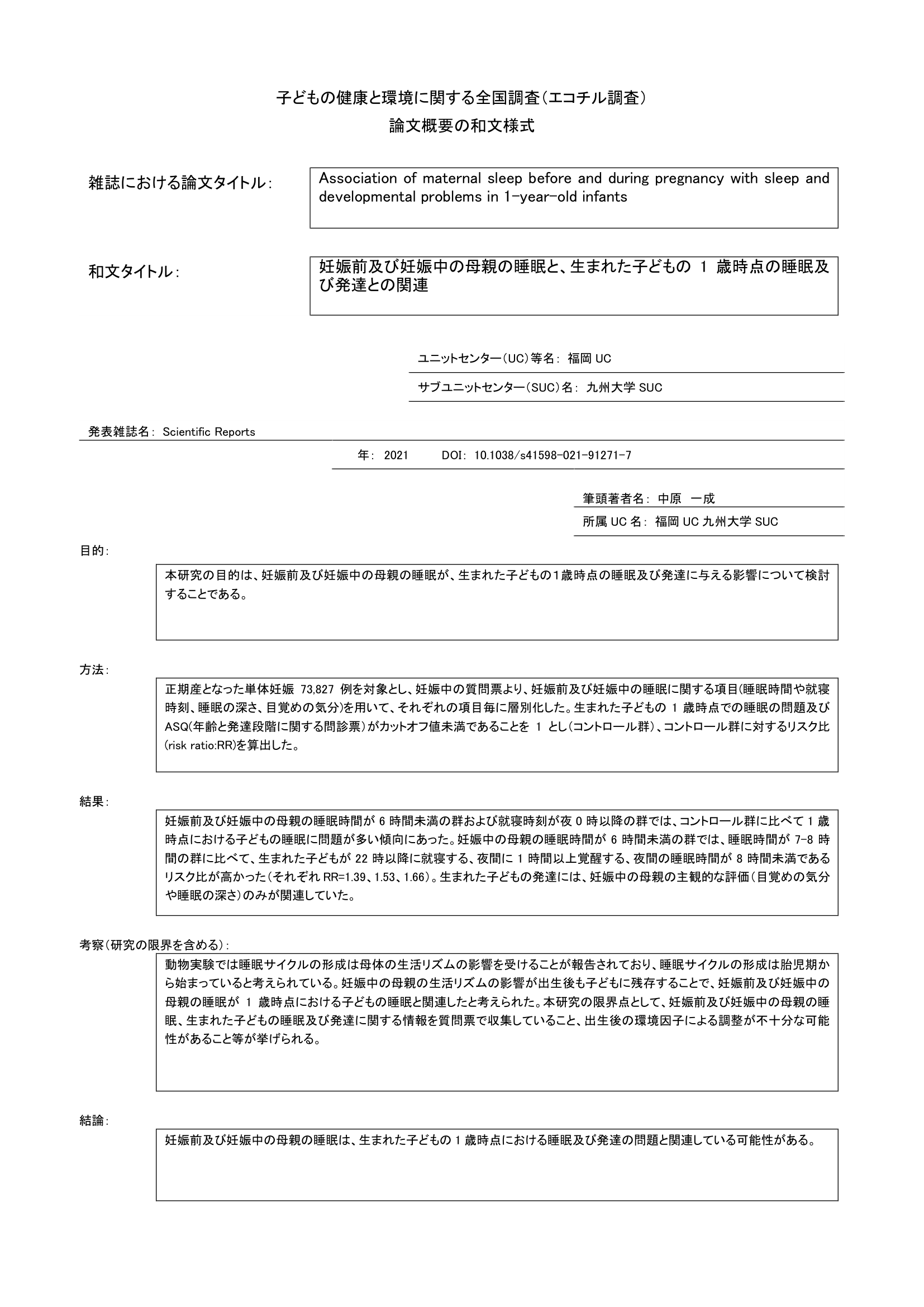 - 妊娠前及び妊娠中の母親の睡眠と、生まれた子の1歳時点の睡眠及び発達との関連を調査