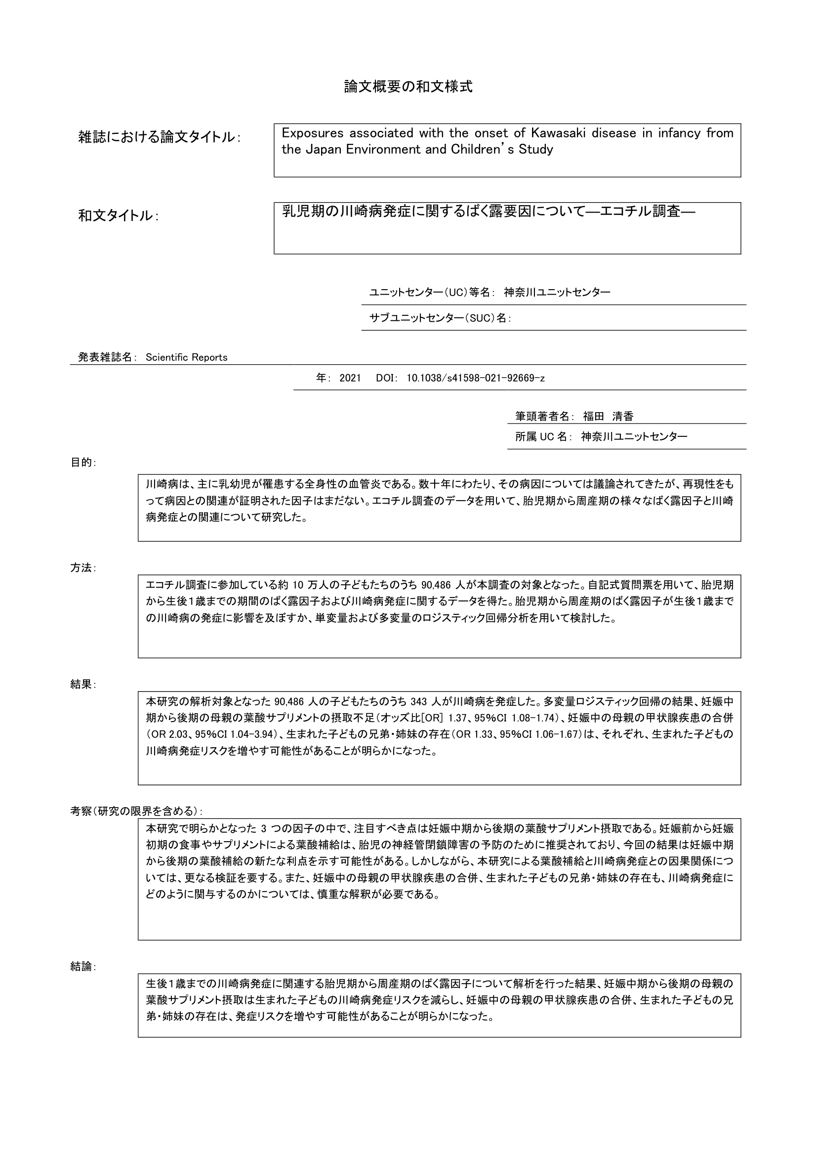 - 胎児期から周産期のばく露因子と生まれた子の川崎病発症との関連について調査