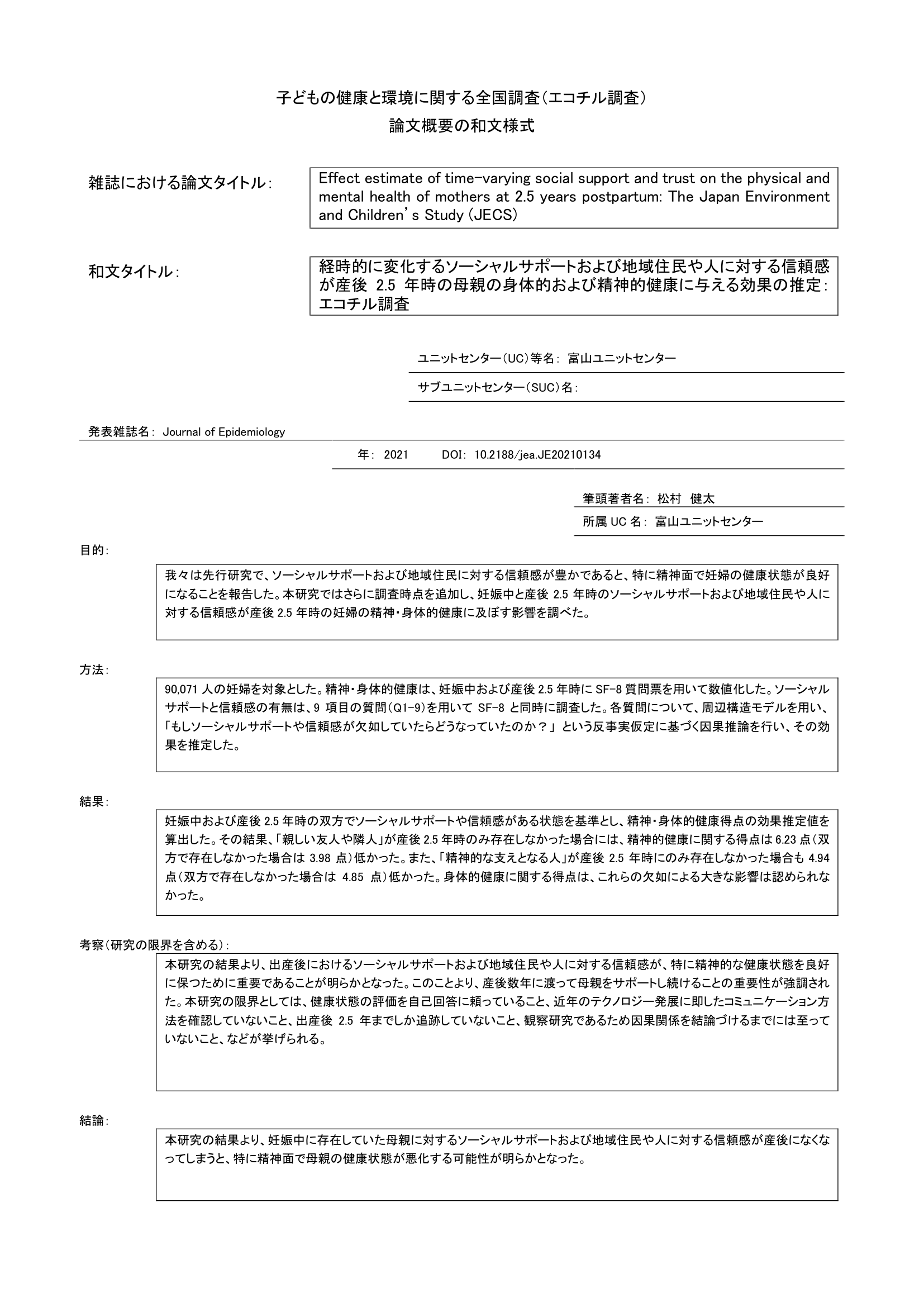 経時的に変化するソーシャルサポートおよび地域住民や人に対する信頼感が産後2.5年時の母親の身体的および精神的健康に与える効果の推定:エコチル調査