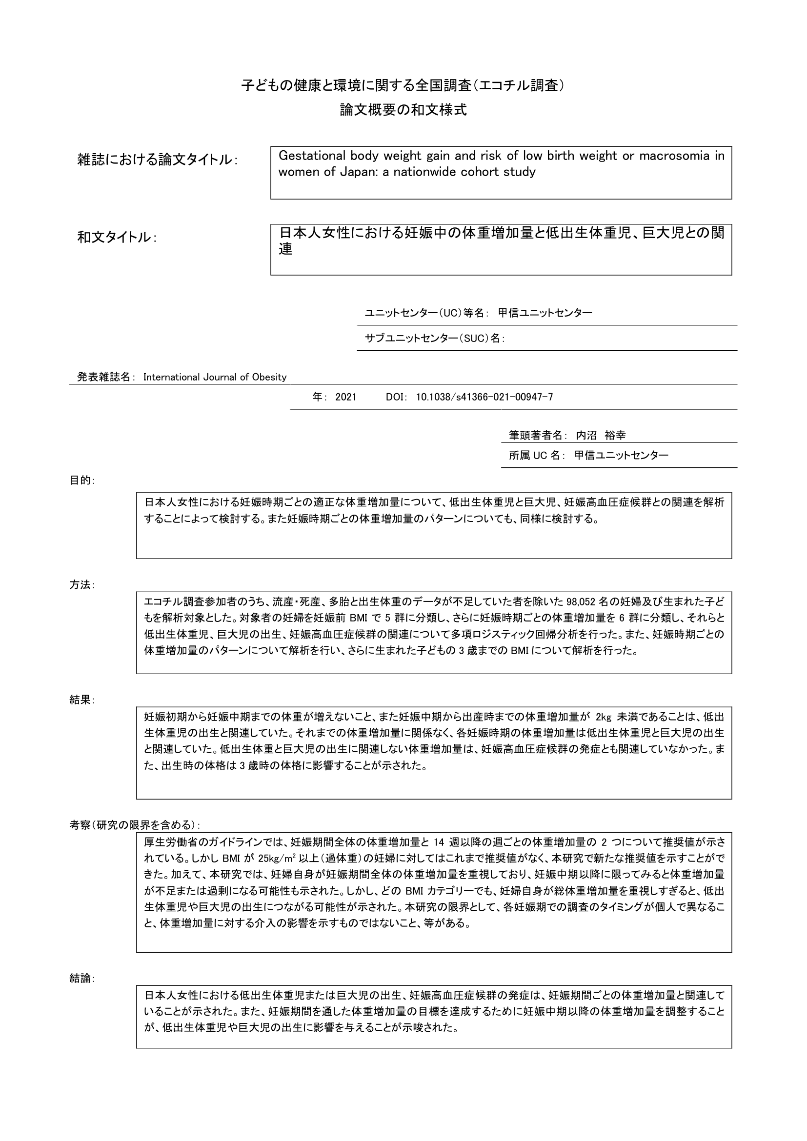 • 日本人女性における妊娠時期ごとの適正な体重増加量を、低出生体重児と巨大児、妊娠高血圧症候群との関連によって調査