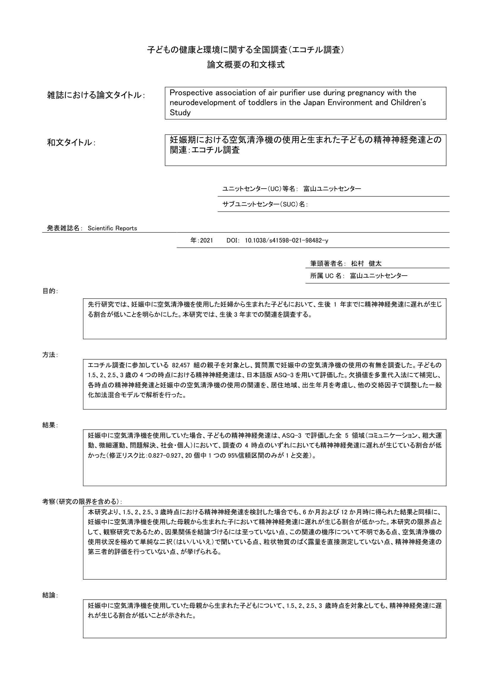 - 妊娠中の母親の空気清浄機の使用と子の生後3年までの精神神経発達の遅れとの関連を調査