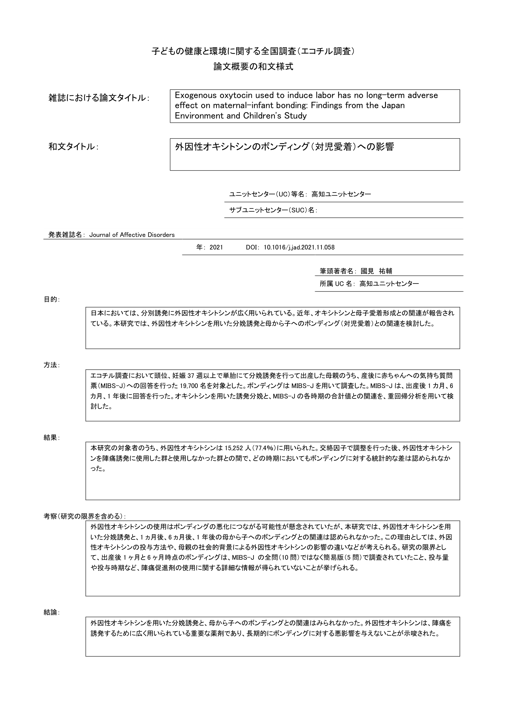 - 外因性オキシトシンを用いた分娩誘発と母から子へのボンディング(対児愛着)との関連を調査