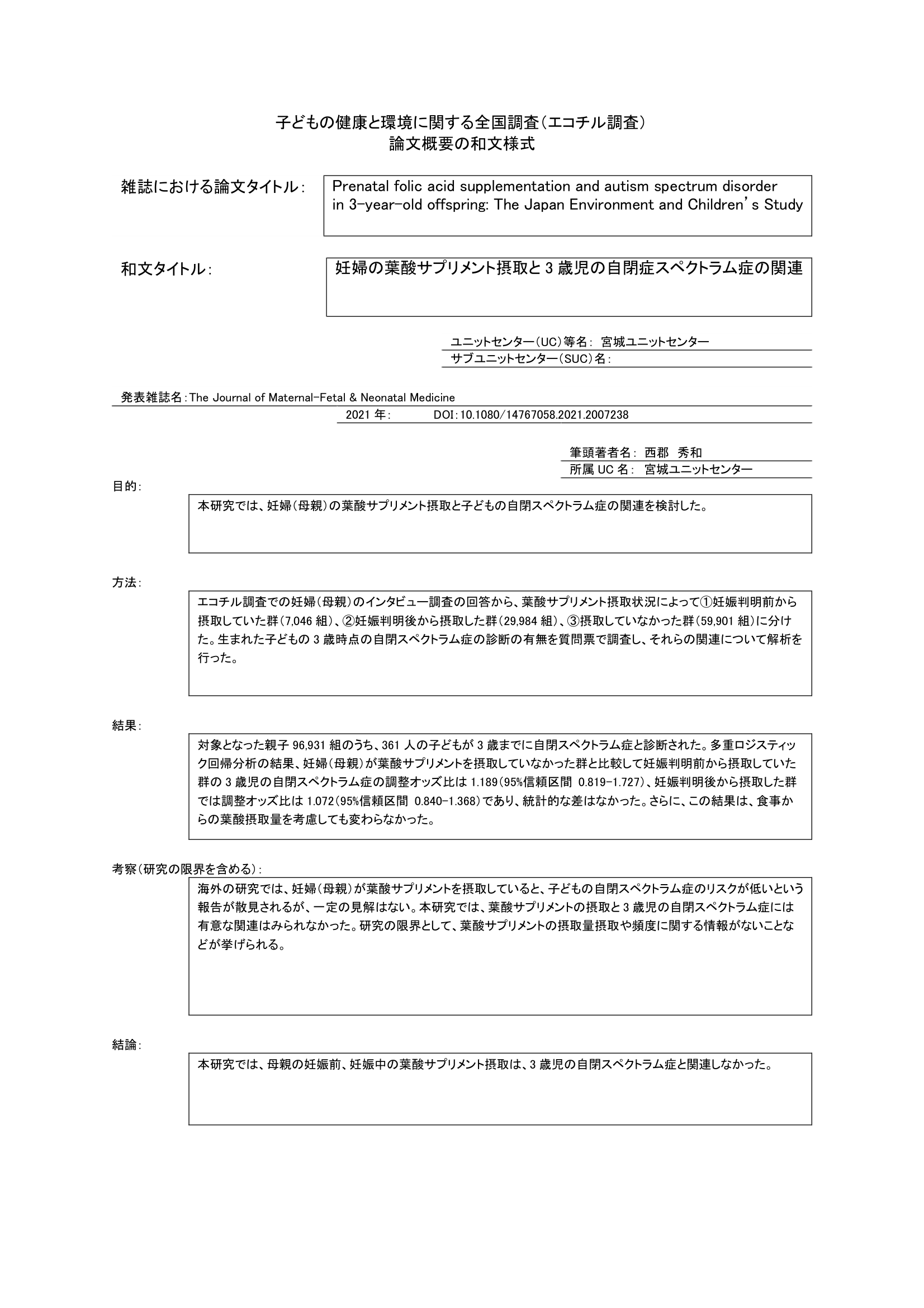 - 妊婦中の母親の葉酸サプリメント摂取と子の自閉スペクトラム症の関連を調査